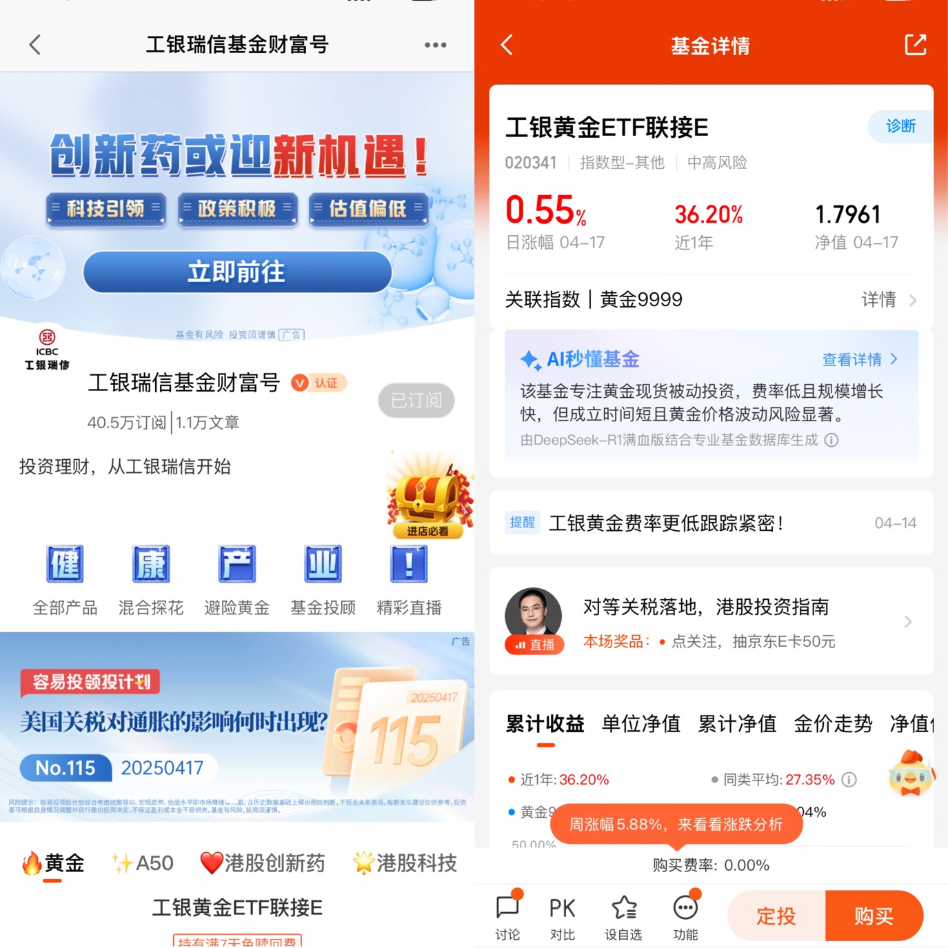 $工银黄金ETF联接E(OTCFUND|020341)$基金主要通过投资于工银瑞信黄金ETF实现对黄金资产的紧密跟踪,追求日均跟踪偏离度不超过0.35%,年化跟踪误差不超过4%。看好黄金板块的投资者 朋友可以配置一部分成为我们资产配置的“压舱石”。
