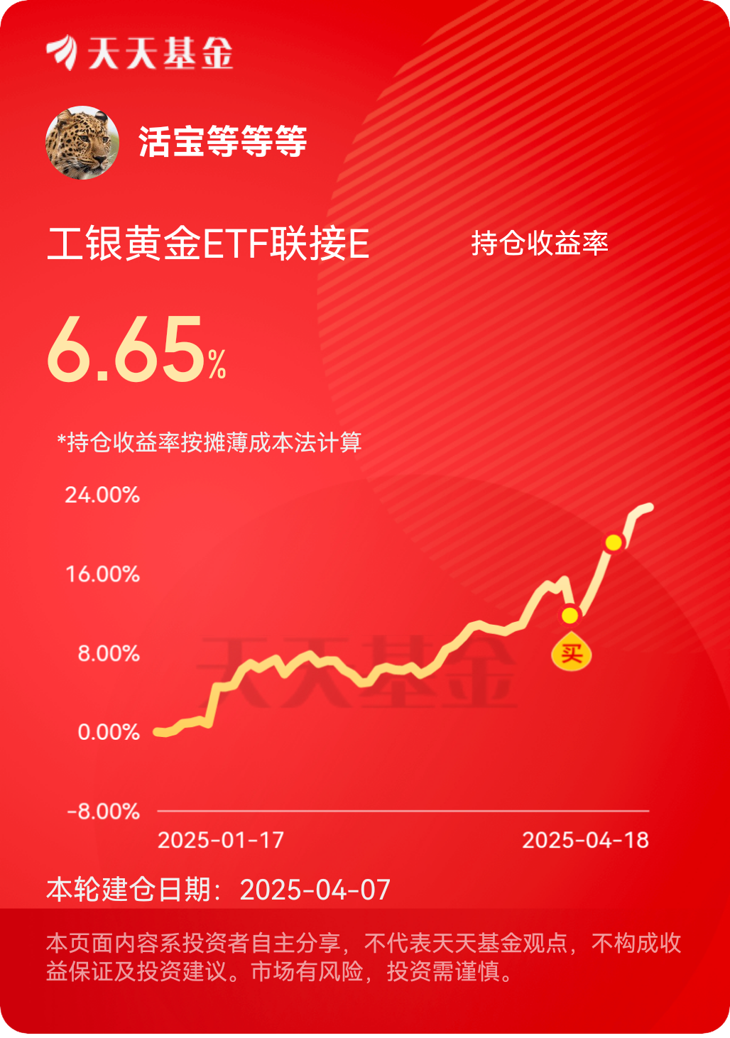 打卡第15天,工银黄金ETF联接E这只基金相对来说费率较低,投资较为便捷,我选择