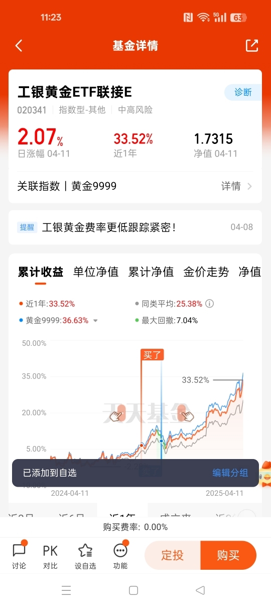 在黄金投资的众多工具中,工银黄金ETF联接E以其独特的优势脱颖而出。首先,它的费率极具竞争力,0申购费,持有7天免赎回费,管理费与托管费合计仅为同类最低一档。这一低费率结构,大大降低了投资者的交易成本。以10万元投资一年计算,相比一些高费率的同类产品,投资者可以节省400元左右的费用,长期积累下来,这将显著提升投资收益。