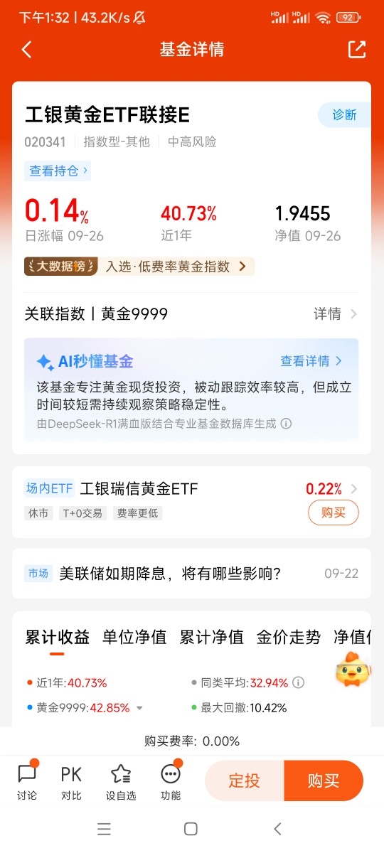 三、工银黄金ETF联接E(020341):低成本参与黄金行情的优选工具