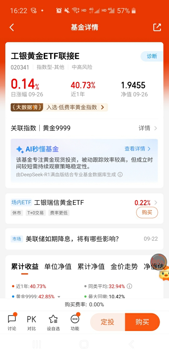 投资黄金,优先黄金基金,其中费率也是我关注的一方面。工银黄金ETF联接E(020341),近1年收益率达到40.73%,是黄金投资的首选。其紧密跟踪9999黄金现货涨幅,0申购费,持有7天(含)以上免赎回费,且管理费+托管费为同类最低一档,管理费率仅为0.15%/年、托管费率仅为0.05%/年。费率如此之低,给投资者减轻了投资成本,无形中增长了收益。我将密切保持关注,择机布局!@工银瑞信基金