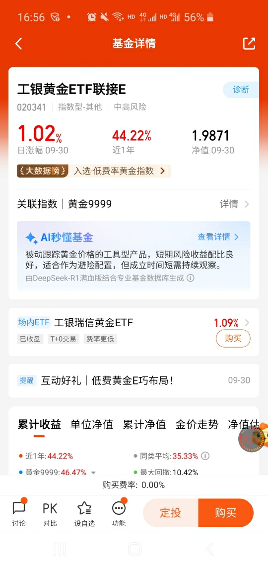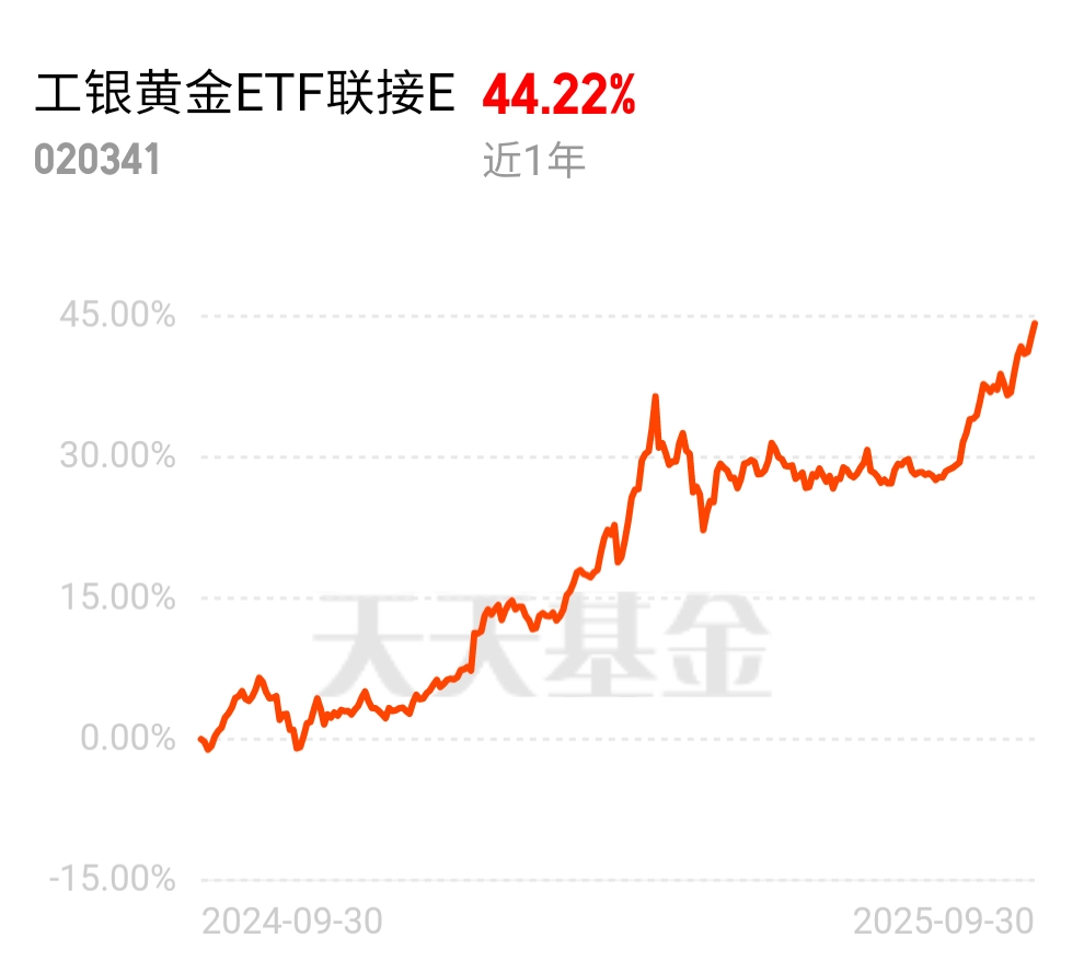 投资黄金,选对工具至关重要,相比金条、黄金首饰,黄金ETF联接基金不失为一个灵活便捷的选择。工银黄金ETF联接E(020341),紧密跟踪9999黄金现货涨幅,10元起购,0申购费,持有7天(含)以上免赎回费,且管理费+托管费为同类最低一档,买卖灵活,方便快捷!近1年收益达到44.22%,且屡创新高,是投资黄金的优选!@工银瑞信基金 $工银黄金ETF联接E$
