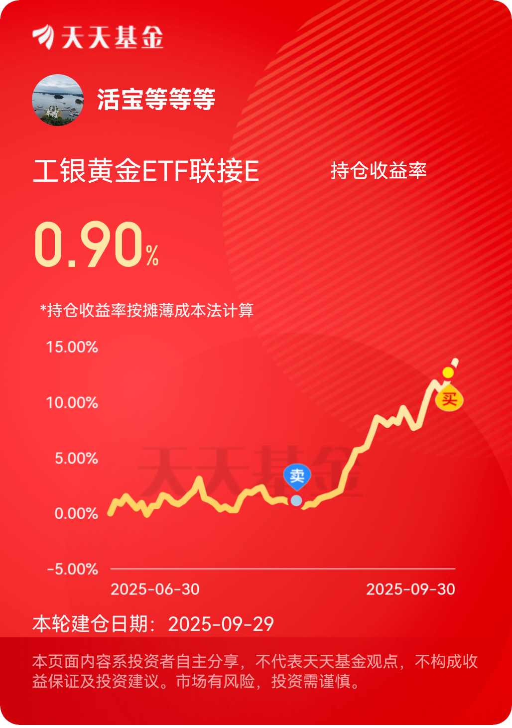 #低费工银黄金E# $工银黄金ETF联接E$ 假期第二天,来聊聊我持有工银黄金ETF联接E的真实感受。早在之前就入手了这只基金,当时就是看中黄金的避险属性,以及它低费率的优势——毕竟投资成本少一点,收益的“获得感”就多一点。