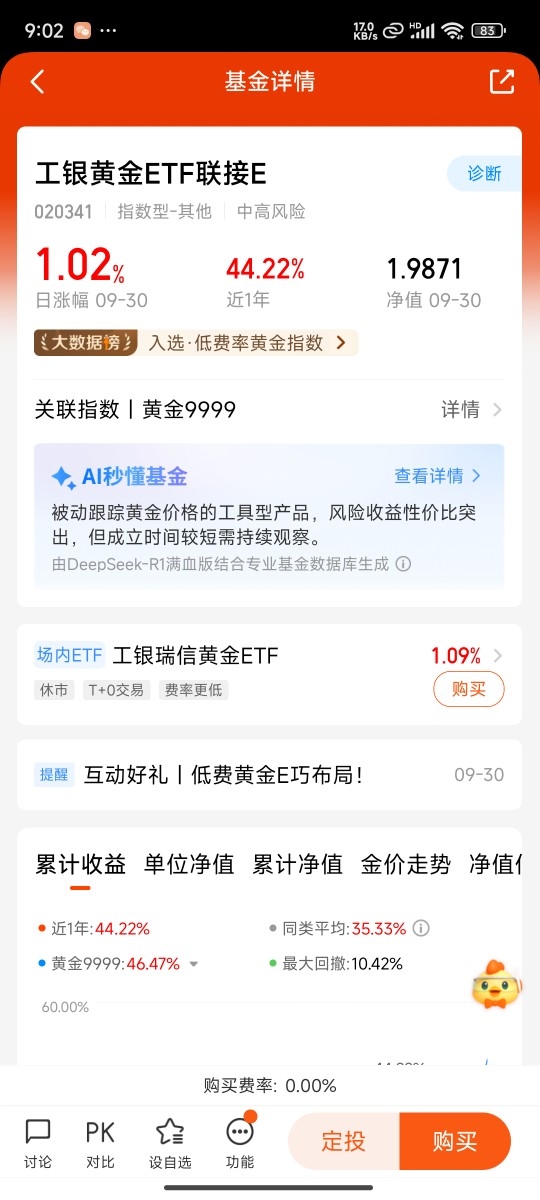 而且除了管理费、托管费,还要看“申购赎回费”。比如有些黄金基金申购费要0.15%,赎回费持有不满7天要1.5%——如果你短期买卖,手续费直接把收益吞了。但像工银那只,0申购费,持有7天以上免赎回费,对想“灵活调整”的投资者很友好(比如市场涨多了想减仓,跌了想加仓,不用心疼手续费)。
