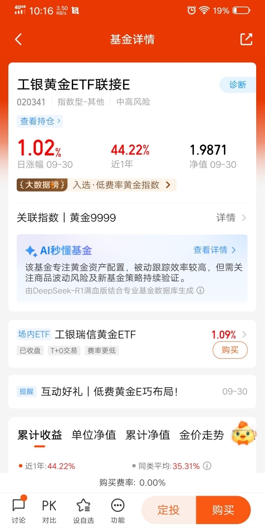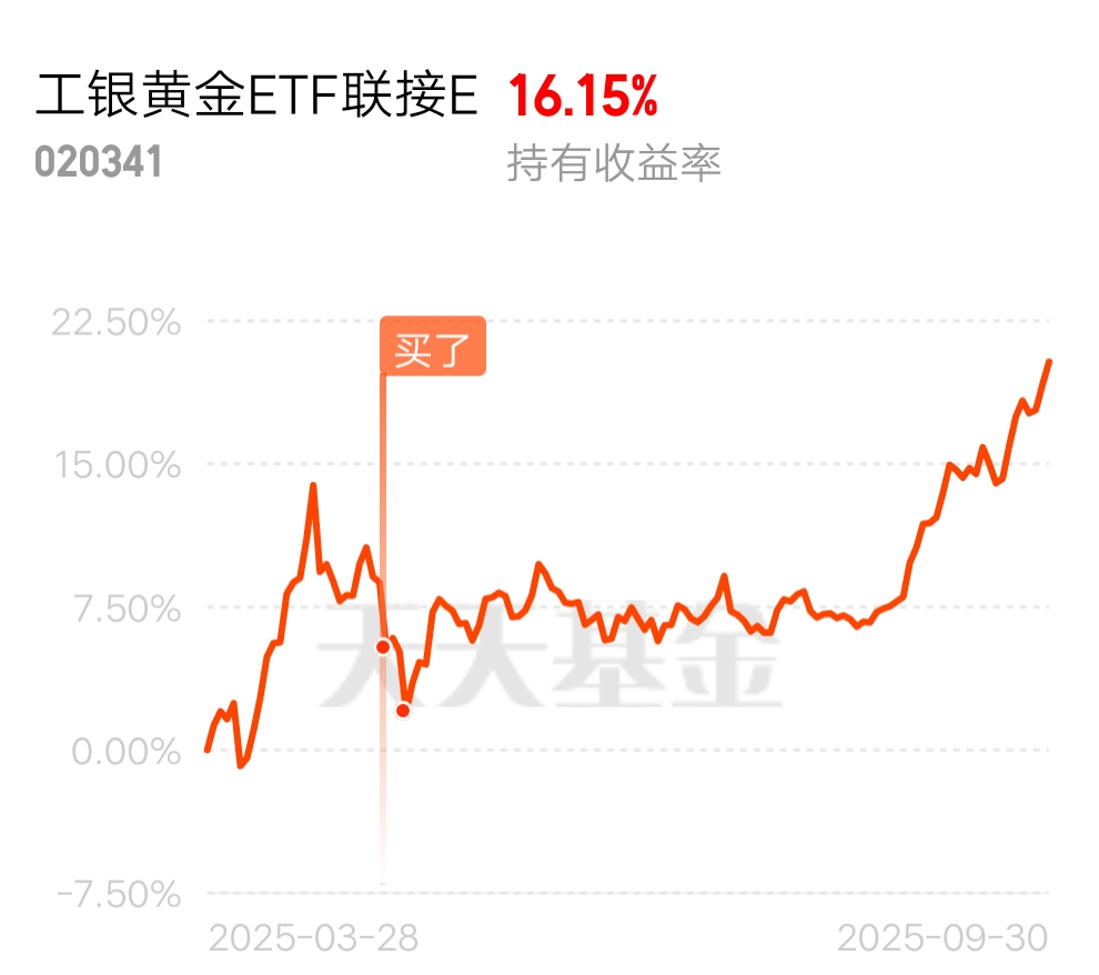 再看市场环境,美联储宣布降息25个基点,这是2024年12月以来首次降息。记得财经专家说过,降息周期里黄金往往表现亮眼:一方面利率下降让黄金的持有机会成本降低,另一方面美元可能走弱,会刺激全球对黄金的需求。加上全球央行还在持续购金,中国央行都连续10个月增持了,这些信号都让我觉得现在配置黄金很有必要。$工银黄金ETF联接E$