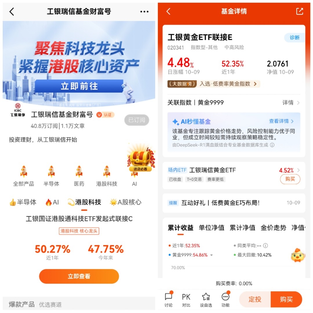 #低费工银黄金E#留言第4天,工银黄金ETF联接E(020341)今日表现出色,截至2025年10月9日,最新净值为2.0761,日涨幅为4.48%。