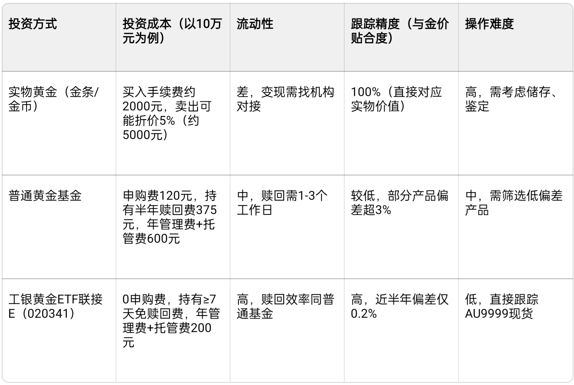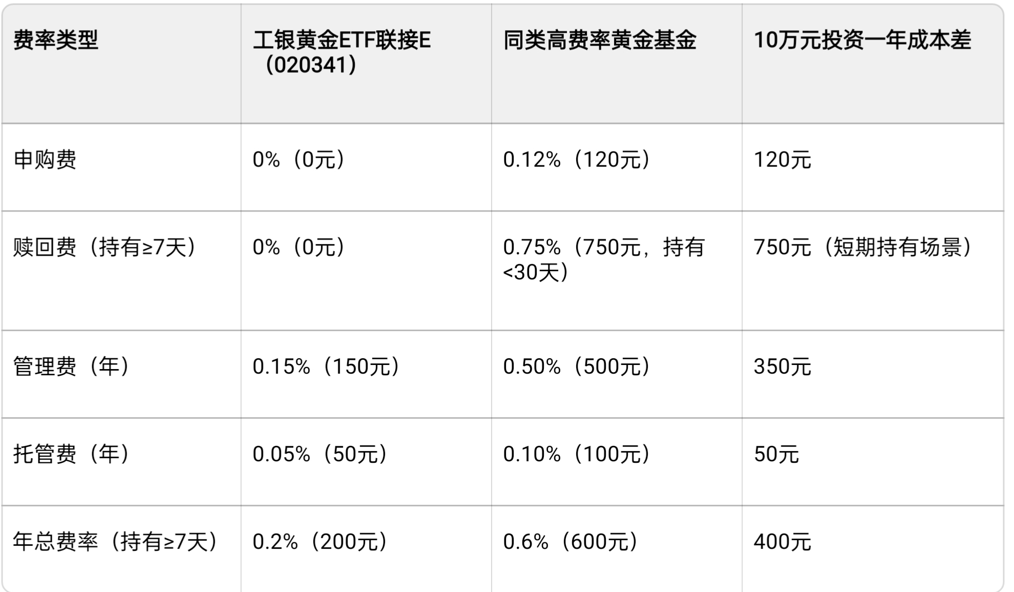 具体到费率细节,我们通过下表对比工银黄金ETF联接E与同类高费率产品的成本差异(以10万元投资为例),更能直观感受到“低费率”对收益的影响: