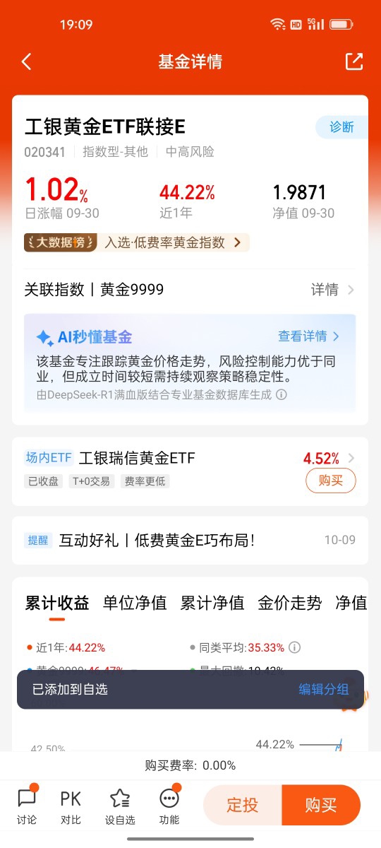 对普通投资者来说,参与黄金行情不用追求“一夜暴富”,关键是找到“成本低、跟踪准、操作灵”的工具,用合理的方式分享收益。$工银黄金ETF联接E$ 的优势就在于,它把费率降下来了,把跟踪精度提上去了,还降低了参与门槛,刚好贴合普通人的投资需求。要是你也在关注黄金配置,不妨多了解下这类工具,结合自己的情况做规划——毕竟好的投资,从来不是跟风追高,而是选对工具、踩准节奏,让资产慢慢增值。