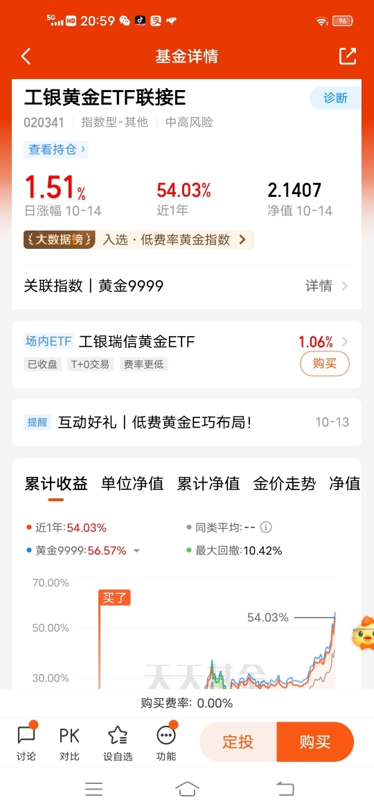 #低费工银黄金E# 投资黄金基金,基民小虎会关注费率,费率低意味着增加了收益,$工银黄金ETF联接E$ 管理费+托管费为同类最低一档,0申购费,持有7天(含)以上免赎回费,今日涨1.51%,年内上涨51.25%,大幅跑赢同类基金36.25%的平均涨幅,在58只同类基金中排名居前,非常棒!