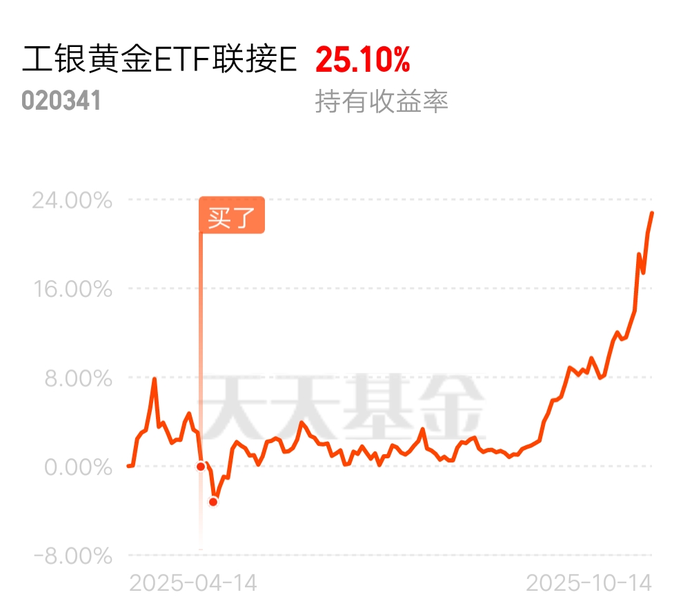 工银黄金E紧密跟踪9999黄金现货,相当于把“黄金”装进了基金里,不用纠结去哪里买实物黄金,也不用承担期货交易的高风险,用买基金的方式就能轻松布局。而且$工银黄金ETF联接E$的费率优势在降息周期里更凸显——长期持有下来,省下的管理费能转化成实实在在的收益。特意看了基金的历史业绩,在之前金价波动的阶段,都能较好地跟上现货黄金的涨幅,稳定性不错。$工银黄金ETF联接E$