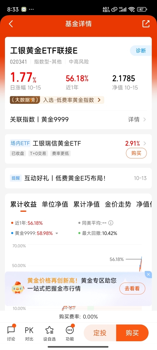 对于普通投资者而言,布局黄金并非只有“买金条”“做期货”两条路。实物黄金存在储存成本高、流动性差的痛点,期货交易则因杠杆属性蕴含高风险,而ETF联接基金则凭借“低成本、高灵活、强跟踪”的特点,成为适配多数人需求的选择。工银黄金ETF联接E(020341)的设计,恰好踩中了当前投资者的核心需求——以最低的成本,紧密跟踪黄金的核心价值。