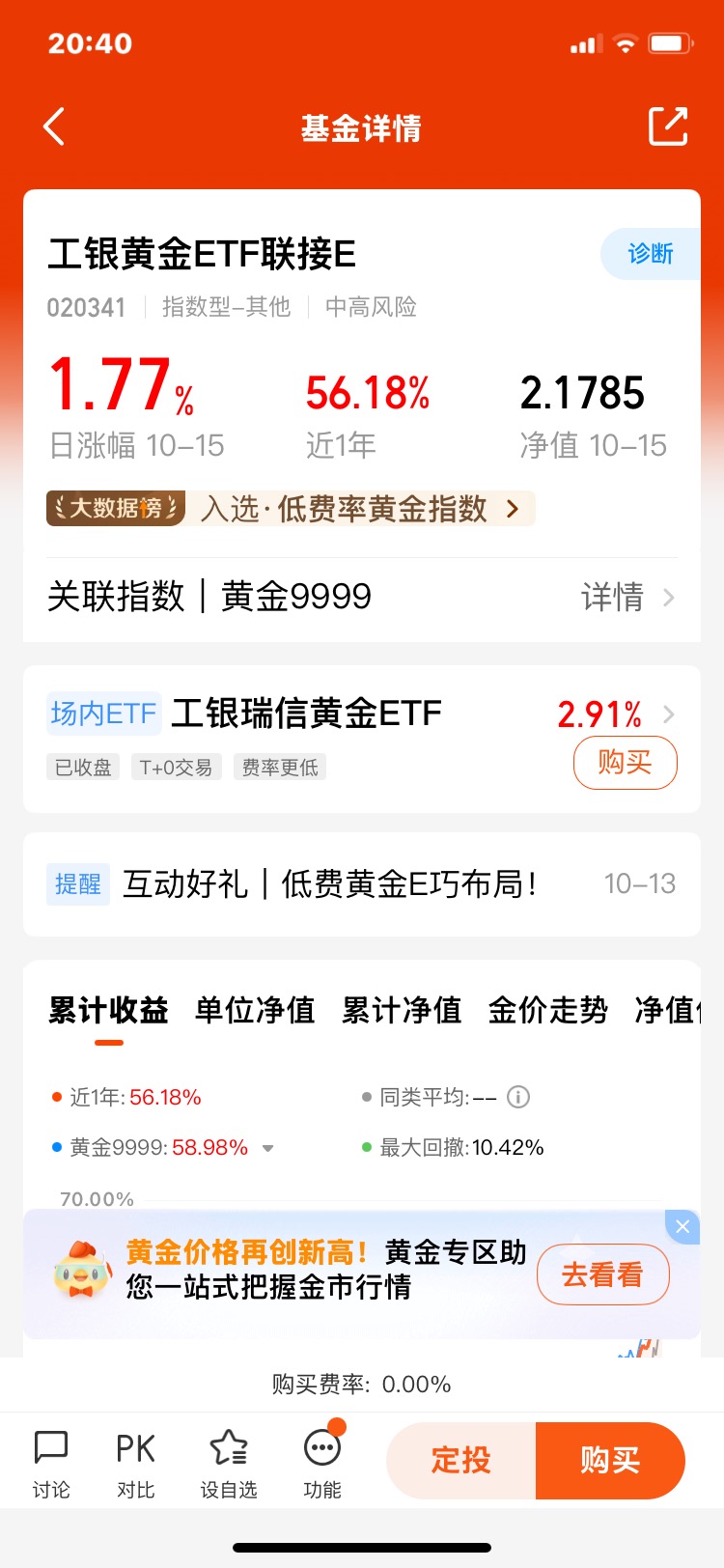 作为跟踪9999黄金现货的ETF联接基金,$工银黄金ETF联接E(OTCFUND|020341)$ 有几个突出的特点: