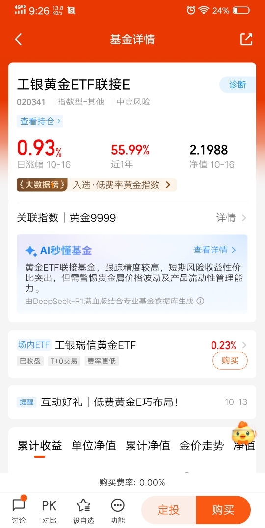 #10月你看好哪些投资赛道?# 今天继续聊聊我看好的黄金投资赛道,以及$工银黄金ETF联接E$ 这款产品。经过昨天的分析,对黄金市场的信心更足了,也进一步研究了这款基金的细节。