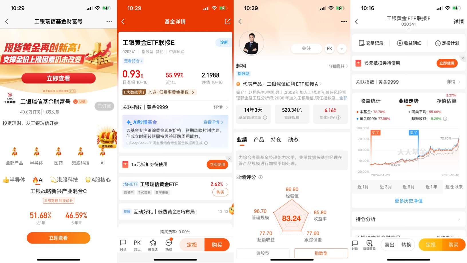 还记得当初建仓的场景,2024年4月,黄金市场不算热闹,甚至还有点冷清。身边朋友要么追着新能源基金跑,要么在消费板块里打转,没人觉得黄金能有啥出息。但我当时就觉得,全球经济那股子不确定性,像悬在头顶的乌云,说不定啥时候就下雨。黄金这东西,几千年来都是避险的硬通货,这种大环境下,它不该被冷落。就这么着,我在天天基金上找到了工银黄金ETF联接E,第一次买入时,心里其实也没底,就想着先试试水,看看这“乱世英雄”到底能不能扛事。