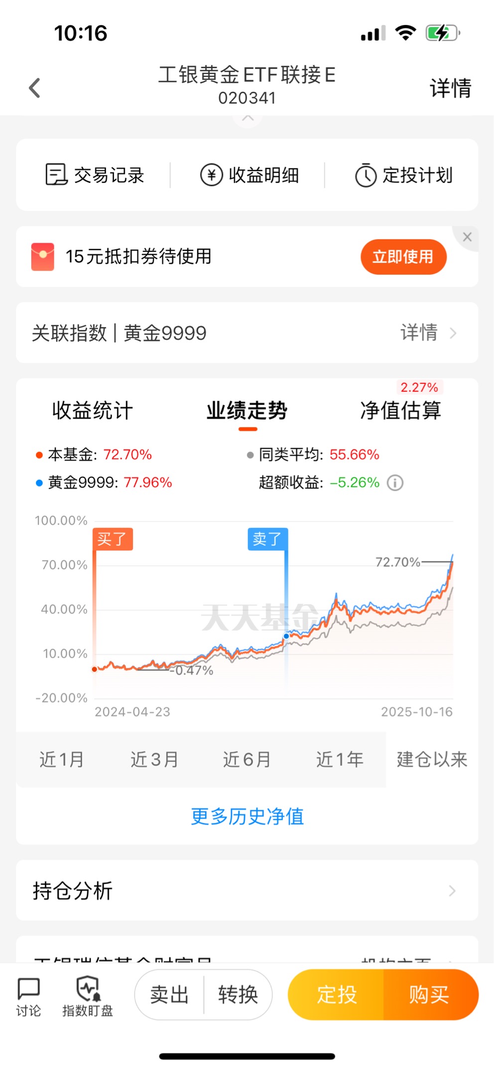 真正让我坚定持有信心的,是去年下半年的那波行情。那会儿美联储加息预期开始降温,市场一下子就像被点醒了似的,资金疯狂往黄金里涌。工银黄金ETF联接E的净值也跟着噌噌往上涨,我看着账户里的收益从个位数慢慢爬到两位数,心里那叫一个踏实。也就是在那个阶段,我做了一次小小的止盈操作,把一部分收益落了袋。现在回头看那个“卖了”的标记,不后悔,但也明白,要是能再拿久一点,收益可能会更可观。这也让我更清楚,对于这种基于长期逻辑的投资,除非基本面发生根本变化,否则真没必要频繁操作。