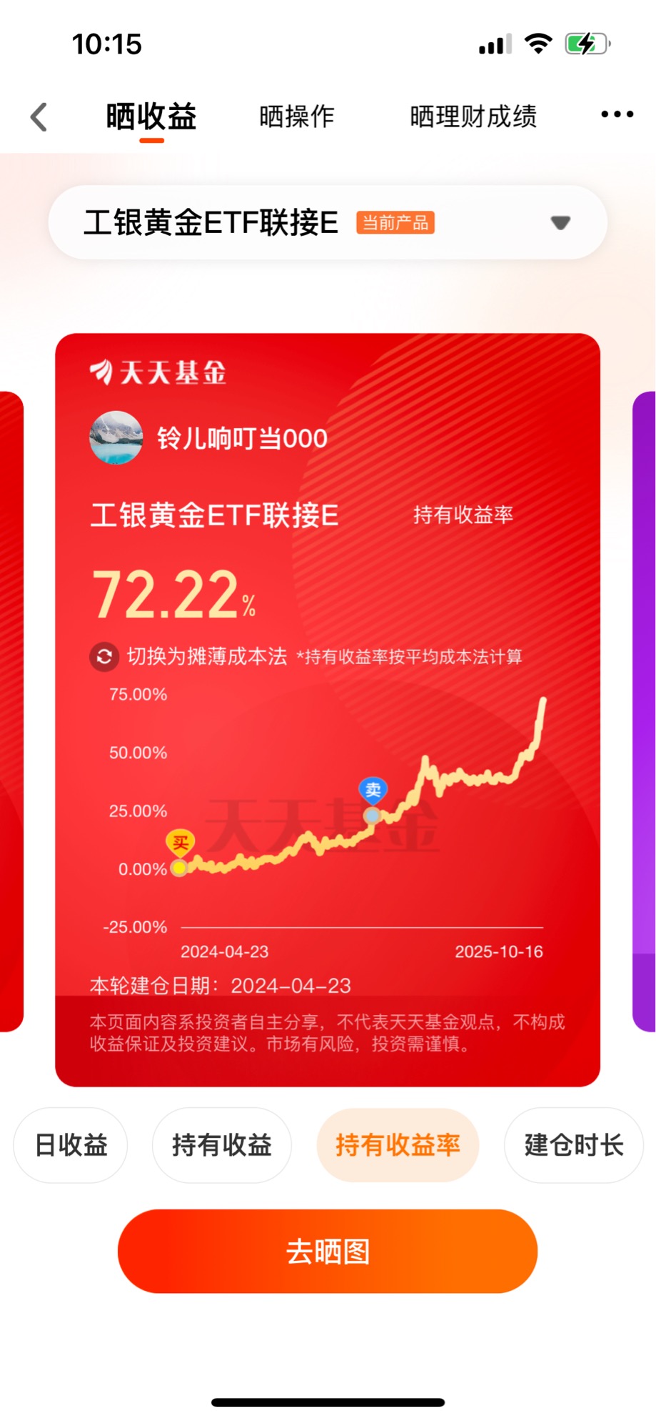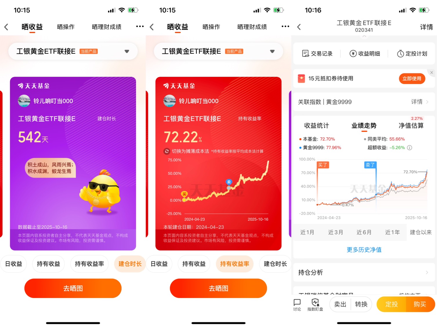 看着账户里工银黄金ETF联接E72.22%的持有收益率,再看看建仓时长542天的标记,心里还真有点感慨。从2024年4月23日第一次买入,到现在快一年半了,这期间市场起起伏伏,我对黄金的认知、对这款基金的操作,也跟着一点点沉淀下来。