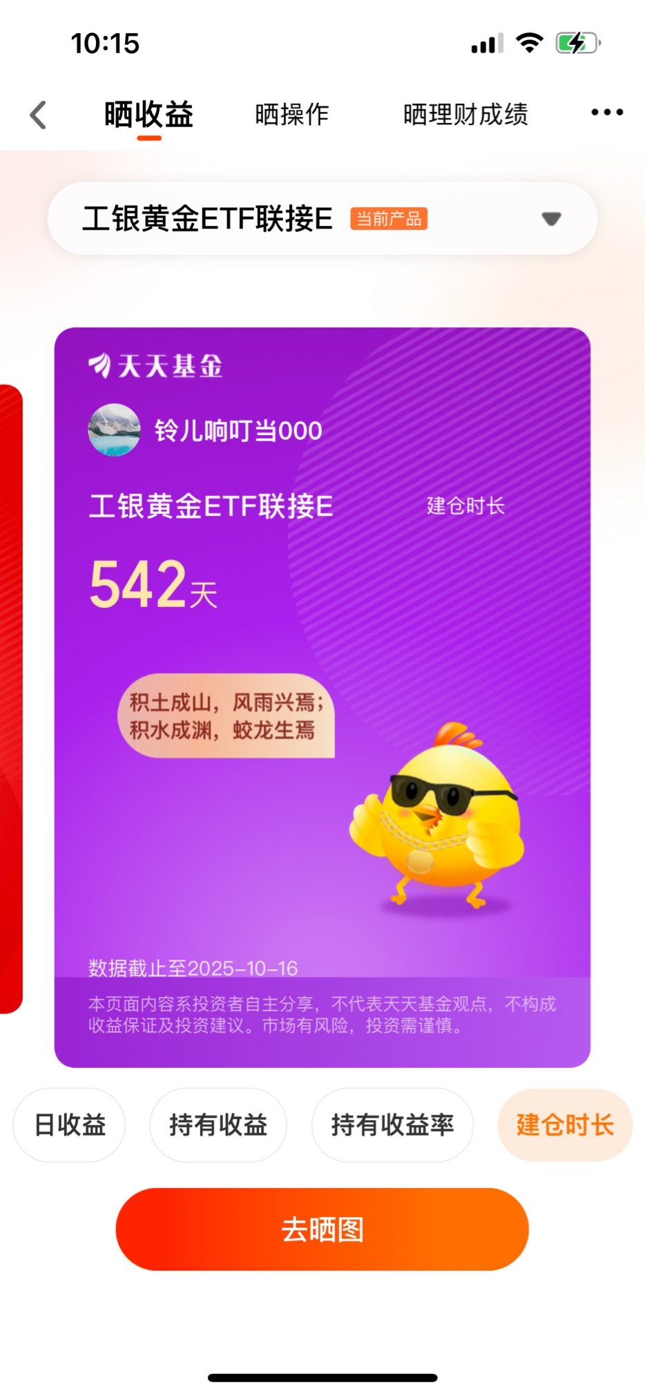 这542天的持有经历,就像一场修行,让我对投资、对市场、对自己都有了更深的理解。工银黄金ETF联接E不仅仅是一个投资工具,更像是一个见证者,见证了我从一个有点懵懂的投资者,逐渐变得成熟、理性、坚定。未来的路还长,黄金市场的故事还在继续,我愿意和工银黄金ETF联接E一起,继续在这场投资的旅途中,探索更多的可能,收获更多的成长。