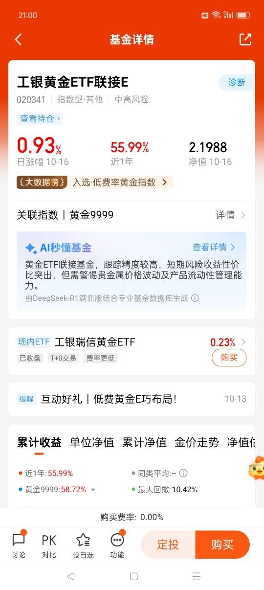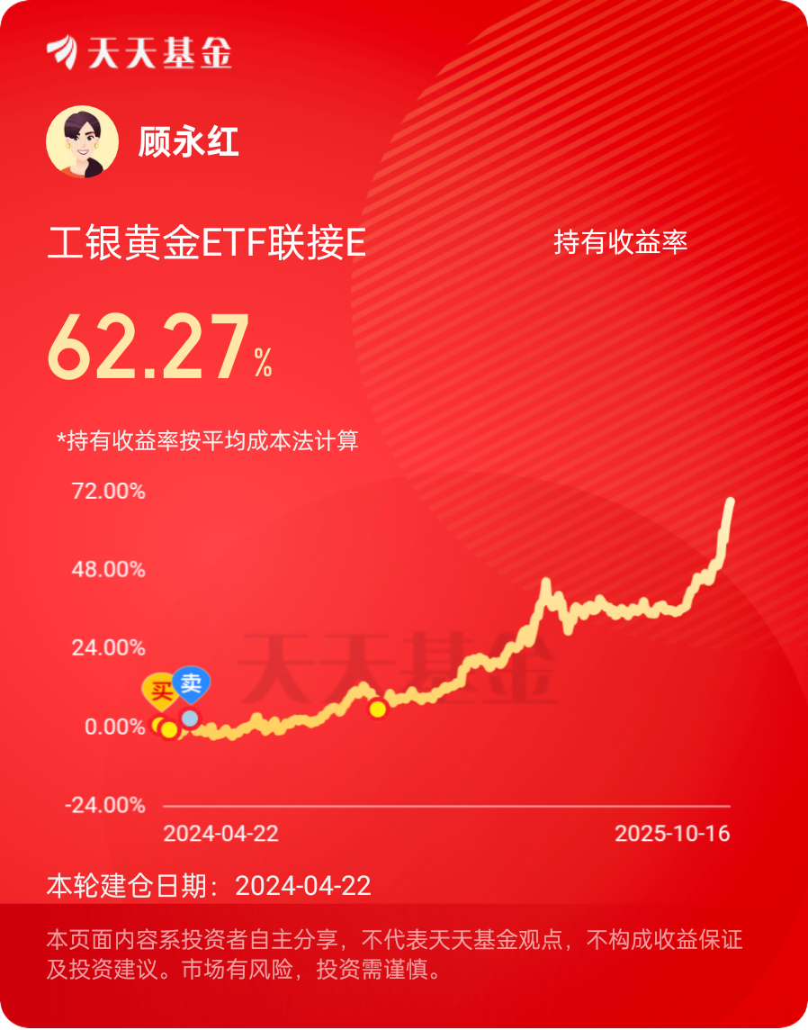 #10月你看好哪些投资赛道?# 布局黄金投资,我会选择$工银黄金ETF联接E$ ,一方面是业绩表现非常优秀:今年以来上涨55.36%(同类基金平均值44.5%),在61只同类基金中排名前列;另一方面是具有低费率优势:申购费率为0,持有7天(含)以上免收赎回费用,管理费+托管费合计为同类最低一档,不失为灵活、高性价比的黄金投资选择。
