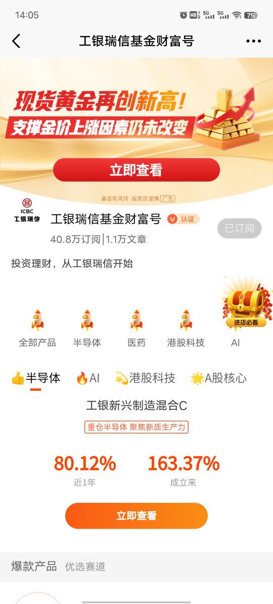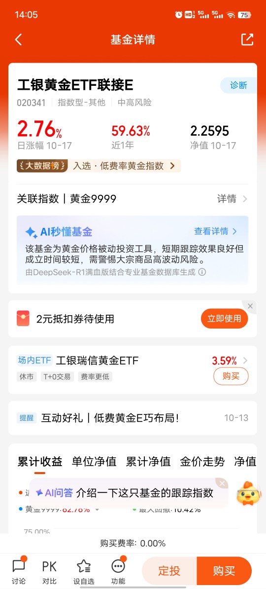 10月我看好有色金属板块,尤其是黄金,本周黄金板块又开始上涨了,$工银黄金ETF联接E$ 近一周上涨10.39%,随着中美摩擦不断,避险资金都买入黄金资产来避险。@工银瑞信基金