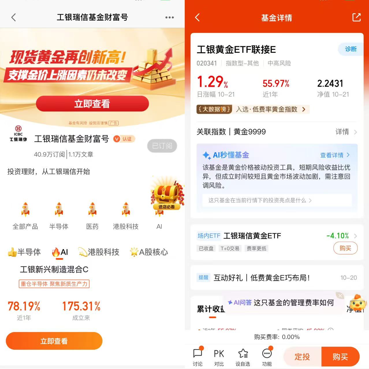 #低费工银黄金E#工银黄金ETF联接E基金(020341)作为一只低成本、高流动性的黄金投资工具,在当前黄金牛市背景下展现出显著的投资价值。该基金实现了"0申购费+7天以上免赎回费+管理费0.15%+托管费0.05%"的极致费率组合,成为同类产品中费率最低的两只基金之一。截至2025年10月21日,基金最新净值2.2431元,近一年收益率高达55.97%,在同类基金中排名前1/4。在美联储开启降息周期、地缘政治风险加剧、全球央行购金潮的多重利好下,黄金价格已突破4379美元/盎司创历史新高,为该基金提供了强劲的上涨动力。