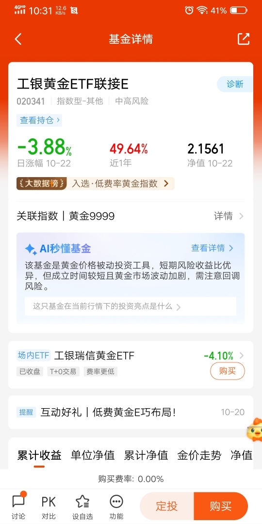 $工银黄金ETF联接E$ 这款产品紧密跟踪上海黄金交易所9999黄金现货价格走势,能精准把握黄金投资机会。更吸引人的是,其E份额申购费率为0,持有7天(含)以上免收赎回费用,管理费与托管费合计还处于同类最低一档,性价比优势明显,对于想布局黄金赛道的投资者来说十分友好。$工银黄金ETF联接E$