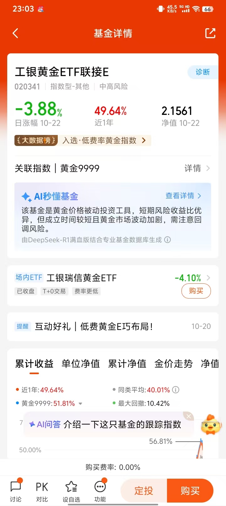 除了直接购买实物黄金外,黄金基金也是大家投资黄金的一个便捷的工具。$工银黄金ETF联接E(OTCFUND|020341)$基金为工银瑞信黄金ETF的联接基金。紧密跟踪黄金资产的表现,追求跟踪 误差的最小化。工银黄金ETF联接作为全市场同类费率最低一档的黄金ETF联接基金,管理费仅0.15%,托管费仅0.05%,除此之外,E份额0申购费,持有满7天免赎回费!是投资黄金的理想工 具。看好黄金板块的投资者朋友可以配置一部分成为我们资产配置的“压舱石”。