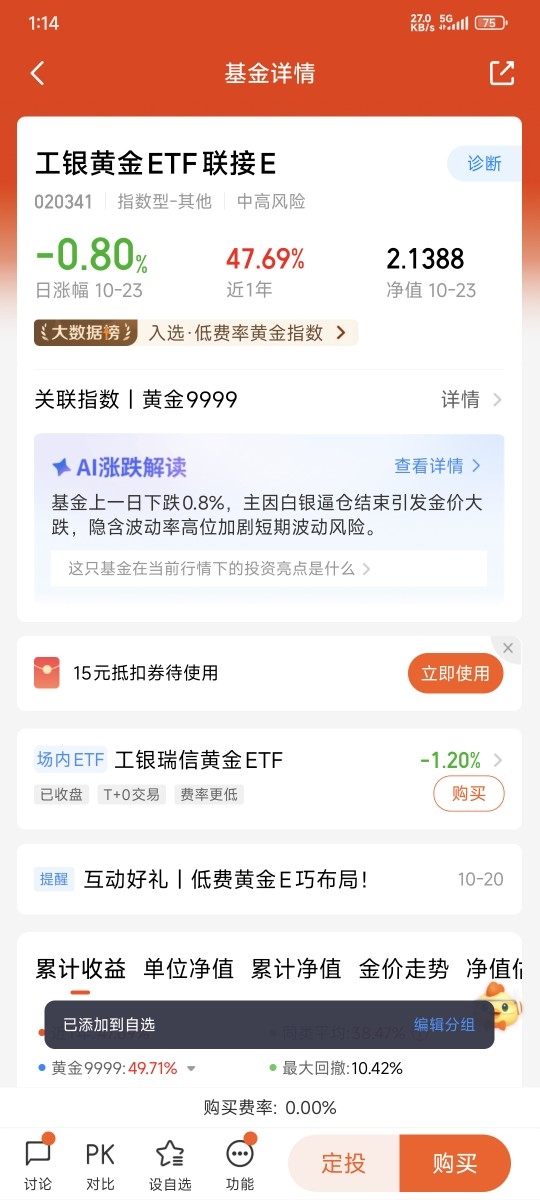 其次,黄金作为防御型资产,其配置本质是"保值重于增值"。若因高费率削弱了这一功能,就背离了配置初衷。工银黄金ETF联接E(020341),紧密跟踪9999黄金现货涨幅,0申购费,持有7天(含)以上免赎回费,且管理费+托管费为同类最低一档,给我更多灵活选择。 我将持续支持$工银黄金ETF联接E$