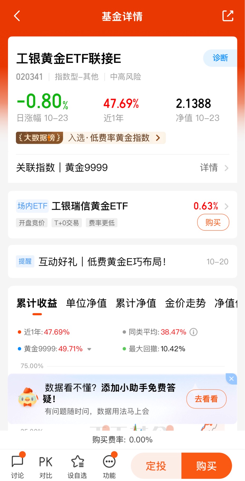 黄金与其他资产(股票、债券)的低相关性使其成为优化投资组合风险收益比的理想选择。研究表明,将黄金占比控制在10%-20%时,可有效降低组合波动率,提升夏普比率。工银黄金ETF联接E近一年的净值增长率达49.64%,显著跑赢沪深300指数。