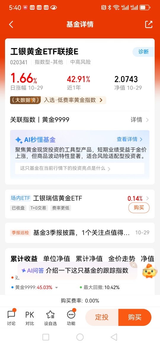 黄金目前还有上升空间,可以长期关注,想参与的可以考虑$工银黄金ETF联接E$,费率最低,波段操作更省钱。