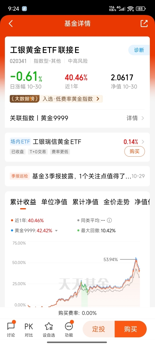 对于大多数投资者而言,直接持有实物黄金存在储存、成色验证和流动性方面的挑战。黄金基金则提供了更便捷的参与方式。在众多工具中,我特别关注了工银黄金ETF联接E(020341)。