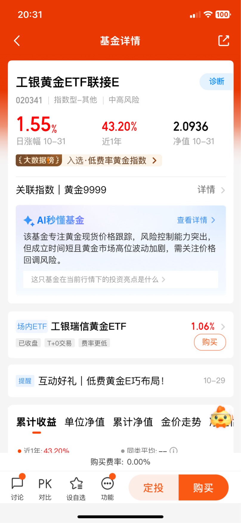 黄金的短期下跌不影响其长期上涨逻辑,回调反而提供加仓机会,我认为值得持续关注。待新的催化事件出现,黄金或仍将表现出优秀的上攻属性。回调就是机会,大家可以关注$工银黄金ETF联接E$ 基金,申赎灵活便捷、费率同类产品最低,跟踪误差小,值得信赖!