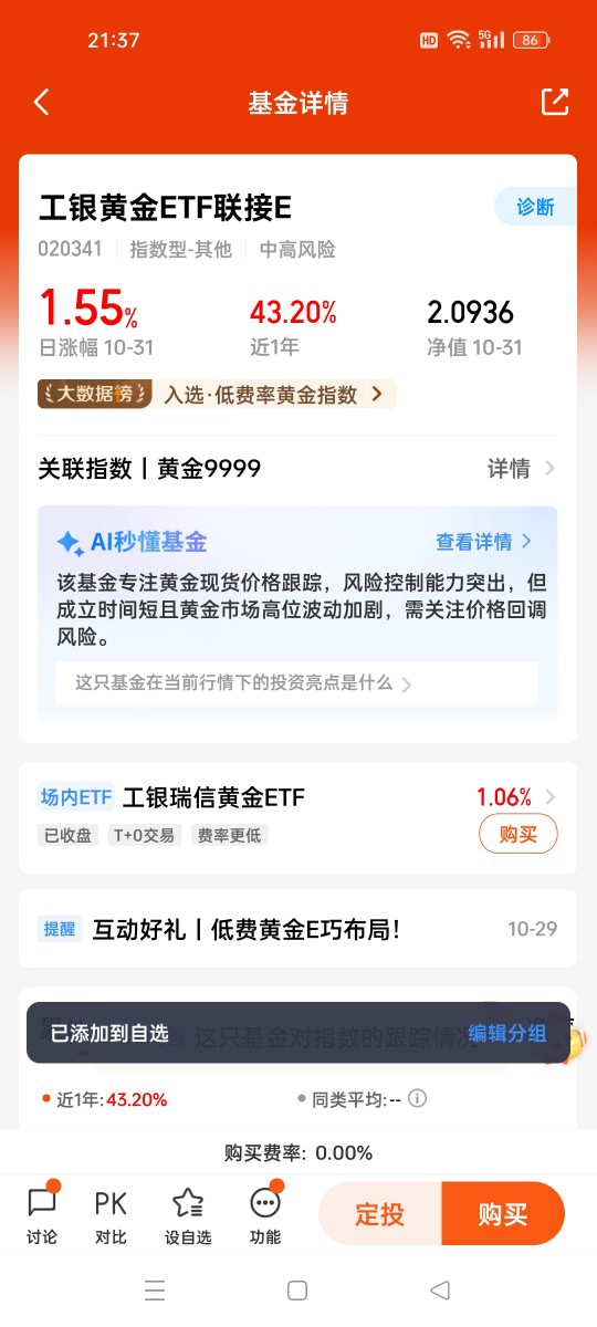 #低费工银黄金E#2025年10月黄金市场上演“过山车”行情,现货金价在4080-4381美元/盎司区间剧烈震荡,单日涨跌幅动辄超2% ,适配波动特性的工具成为投资关键。$工银黄金ETF联接E$ 的产品设计恰好契合波段与定投双重策略需求。
