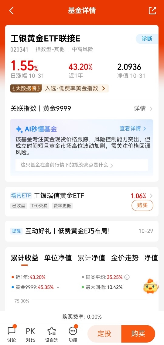 不过本轮由关税引起的黄金异动风波打了我一个措手不及,有很大一部分原因是注意力在科技板块,而忽视了黄金的投资,在关税扰动告一段落以及地缘政治冲突缓解的当下,金价有了很明显的回撤,但并不会影响其长期投资价值,全球经济格局依然复杂,在这个长期过程中,资金的避险情绪不会消失,而当本轮回调足够充分时,就会是黄金的下一次上车机会,$工银黄金ETF联接E$ 7免黄金基,费率低廉,适合成为我后续捕捉与布局黄金的好帮手,看好的长期投资价值!@工银瑞信基金