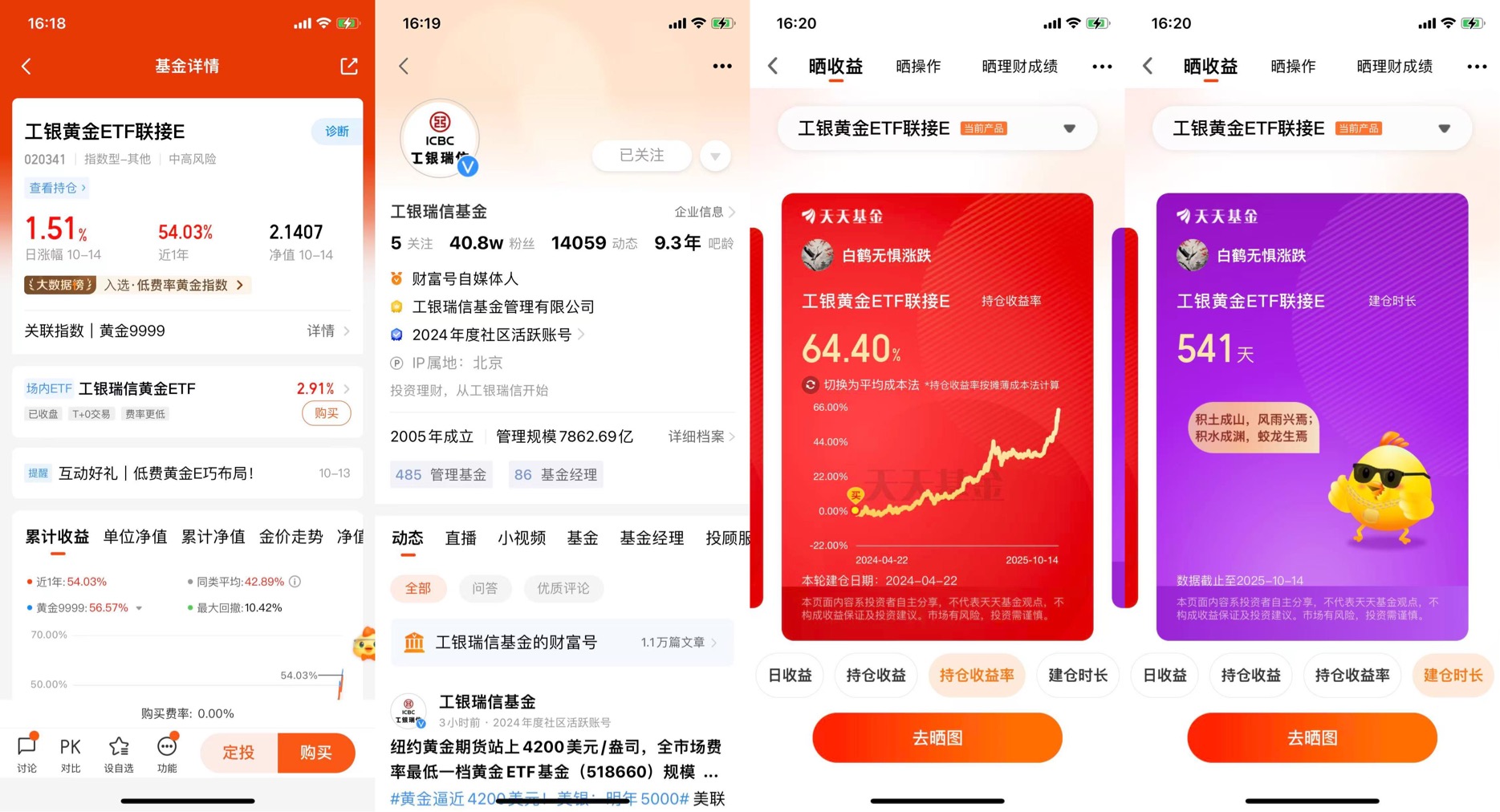 说到基金经理,赵栩的经验也为这只基金加了不少分。他管理过多只指数基金,擅长精准把握市场节奏。从基金的表现来看,赵经理的管理风格也十分稳健,今年工银黄金ETF联接E的表现已经取得了超过50%的涨幅,足以证明其团队在黄金投资领域的专业性。