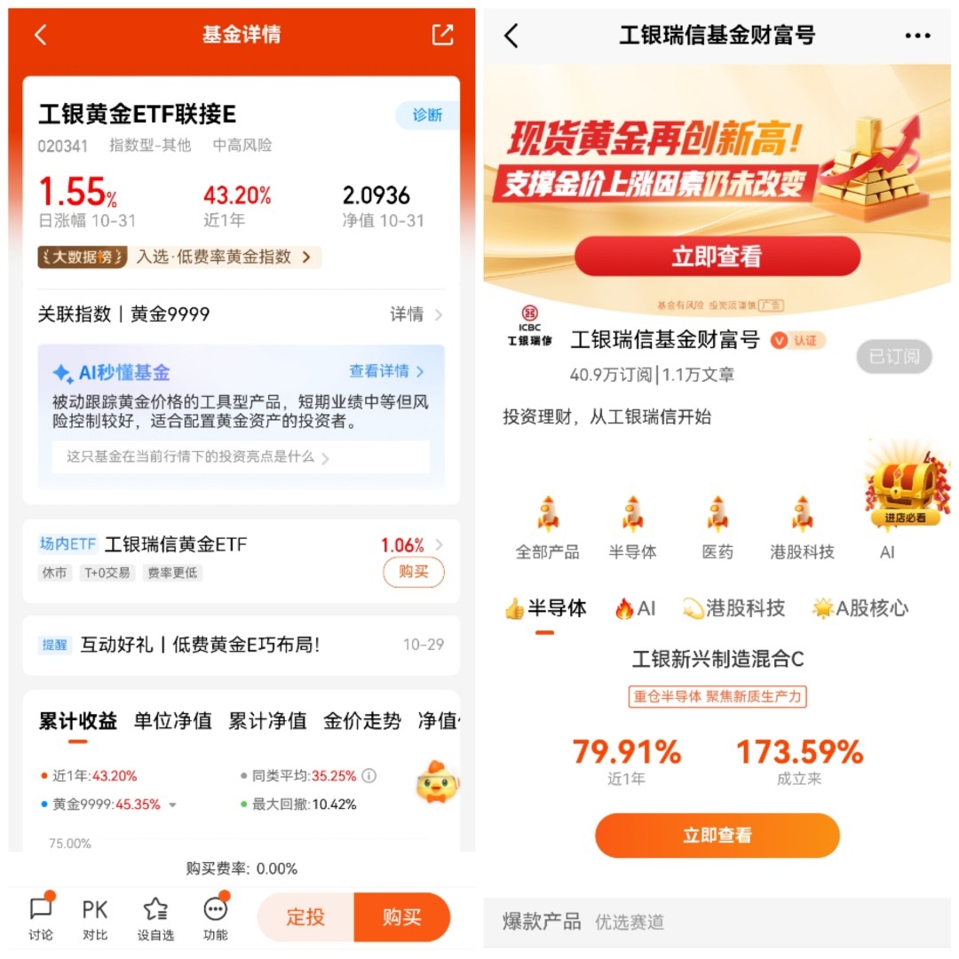 而10月下旬出现的短期回调,更多是市场的阶段性正常调整,并非黄金上涨逻辑发生逆转。此次回调主要源于两方面原因,一方面是此前黄金价格一路飙升至4381美元的历史高位,不少投资者在获得丰厚收益后选择卖出落袋为安,大规模的获利回吐行为直接导致了黄金价格的短期下跌,进而拖累基金净值;另一方面,从技术层面来看,黄金价格在连续暴涨后本身就存在回调需求,就像快速奔跑后需要放慢节奏调整一样,这种阶段性回调是市场消化短期获利盘、积蓄后续上涨动能的正常过程。而且从后续基金净值快速回弹的表现也能看出,支撑黄金上涨的核心因素并未改变,全球央行购金、美联储降息预期、地缘政治风险等关键支撑点依然存在,这也让工银瑞信黄金E的中长期走势依然被市场看好,高盛与瑞银等机构的模型也指出,短期波动不会改变长期趋势,2025年四季度黄金价格有望挑战4500美元区间,工银瑞信黄金E也将随之持续受益于黄金市场的良好走势。