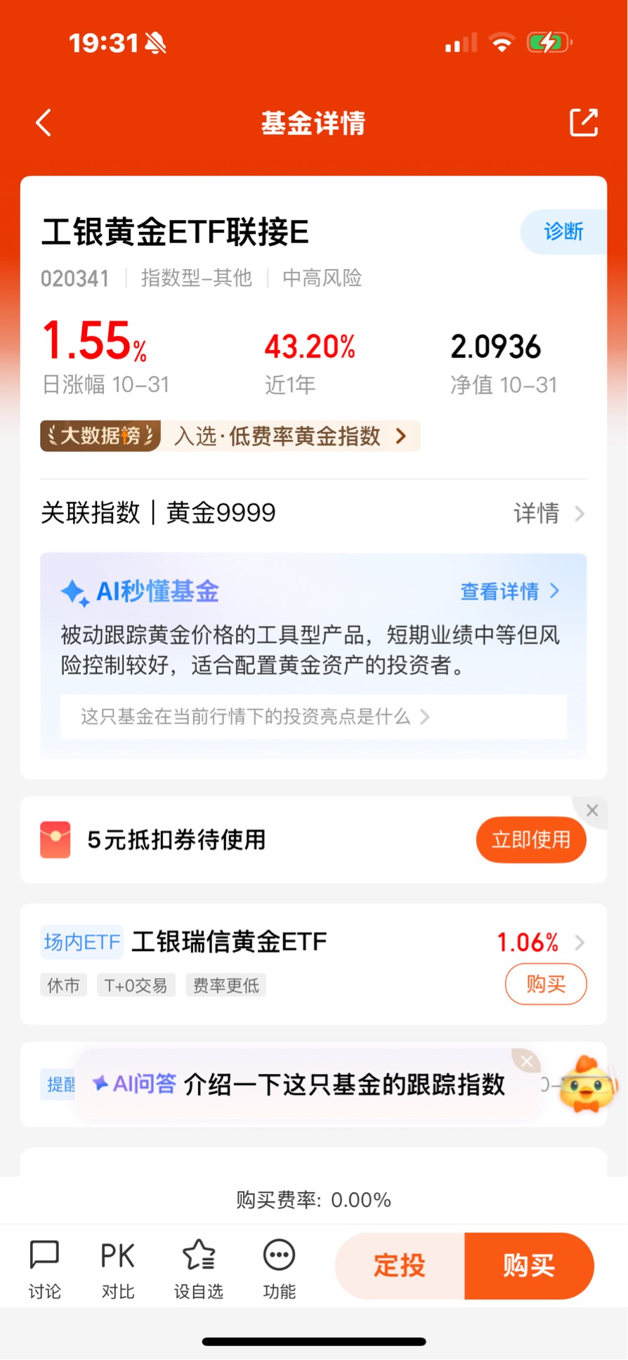低费率优势:工银黄金ETF联接E的管理费为0.15%/年,托管费为0.05%/年,费用水平处于同类产品最低档。此外,E类份额独有“0申购费+持有7天免赎回费”规则,能有效降低投资者的交易成本。