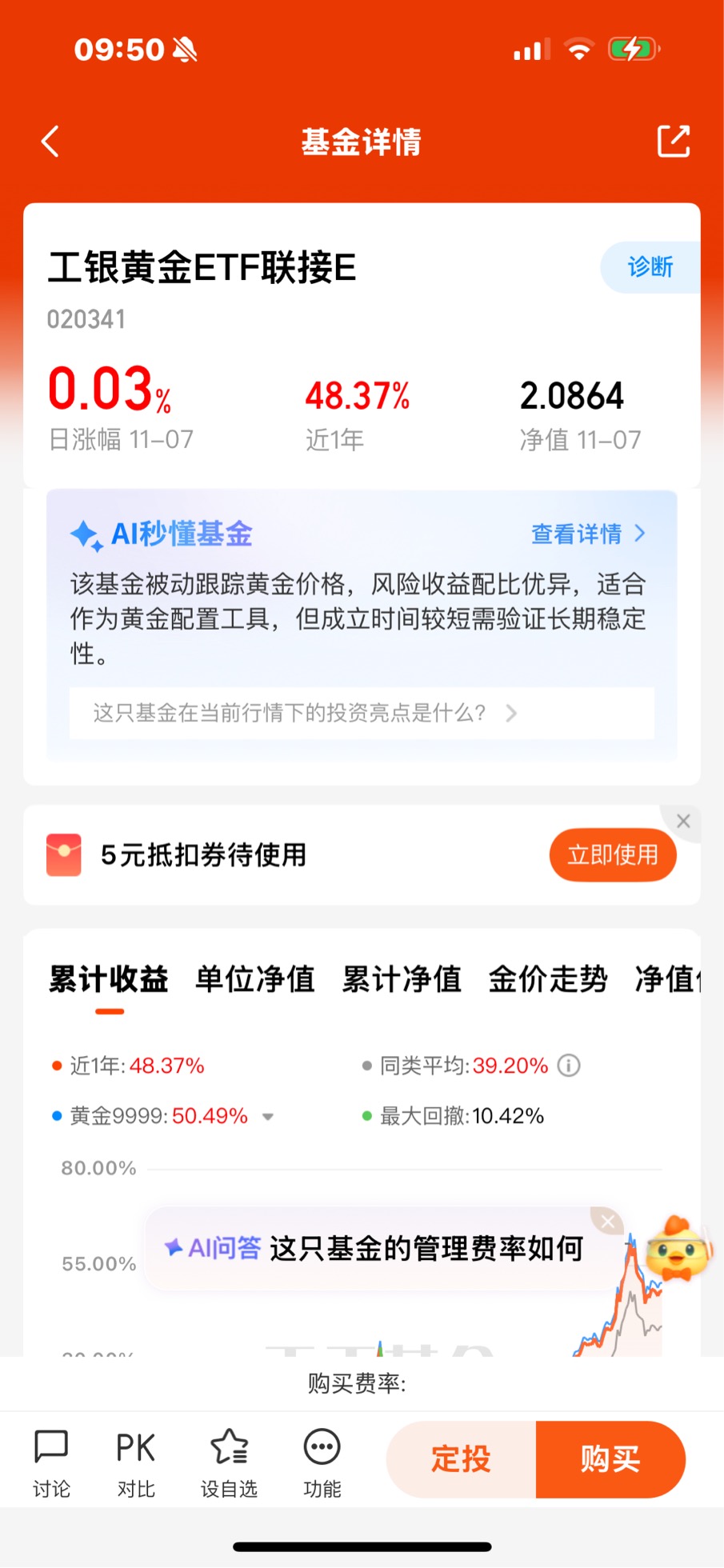 历史业绩表现出色:截至2025年11月7日,工银黄金ETF联接E近1个月涨幅为5.00%,近3个月涨幅为16.85%,近6个月涨幅为14.24%,近12个月涨幅为48.37%,业绩表现亮眼。