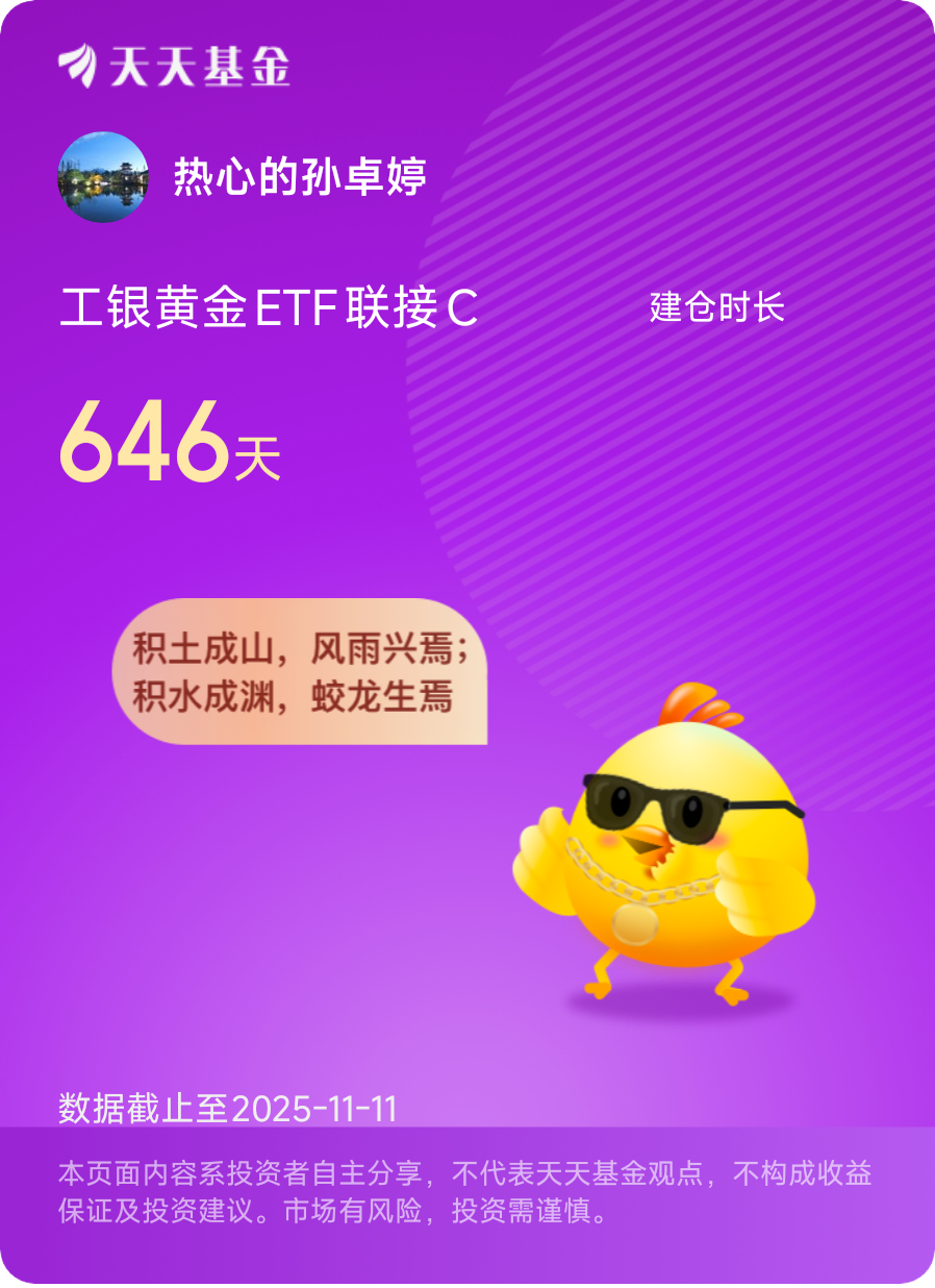 现在每月收到基金扣款短信时,我都觉得是在给未来攒“安全感”。黄金就像理财里的“定海神针”,在不确定的经济环境里,能给我们这些新手一份稳稳的安心。有没有同款定投工银黄金ETF联接E的姐妹?你们是怎么看待黄金波动的?欢迎在评论区交流~ 祝我们都能靠理性投资,慢慢变富
