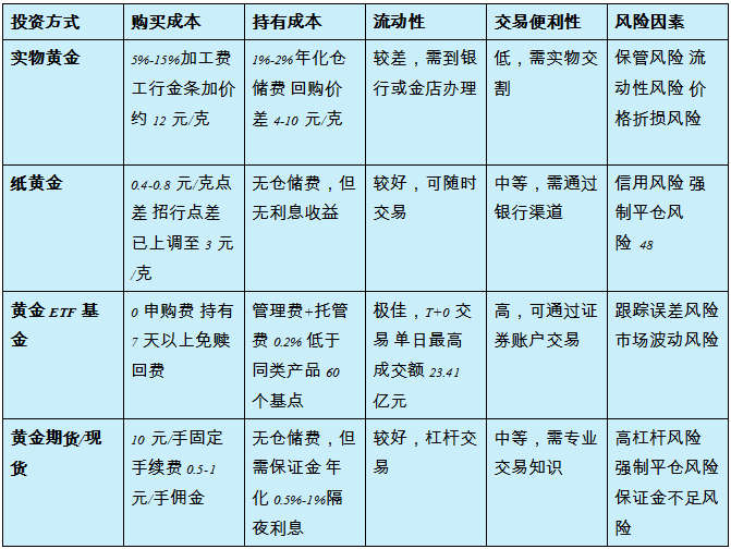黄金基金产品与实物黄金、纸黄金相比,具有明显的成本优势和流动性优势。下表详细比较了各类黄金投资方式的特点: