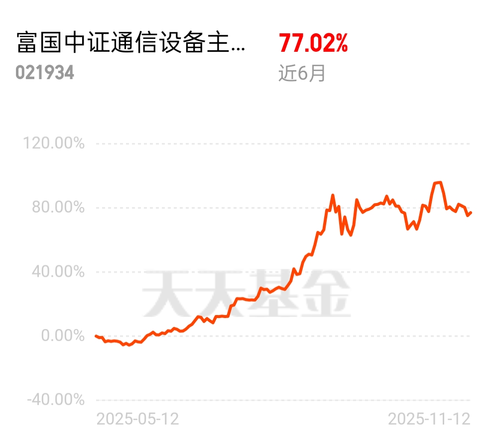 眼下加了富国中证通信设备主题ETF联接C,和手上的黄金基金搭配着来——一个稳底仓,一个搏5G、算力这些新基建的弹性,近6个月涨了77%,跑赢多数同类大多数同类。$富国中证通信设备主题ETF发起式联接C$