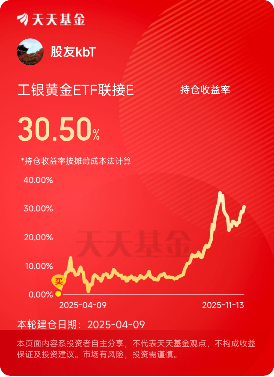 黄金不是“暴富工具”,而是“风险对冲工具”。它的价值不在于涨多少,而在于当其他资产跌的时候,它能帮你扛住一部分损失。现在金价虽然在高位,但只要长期配置的逻辑没改,全球经济还有不确定性、美联储降息周期没结束、央行还在囤金,就值得继续配置 。@工银瑞信基金