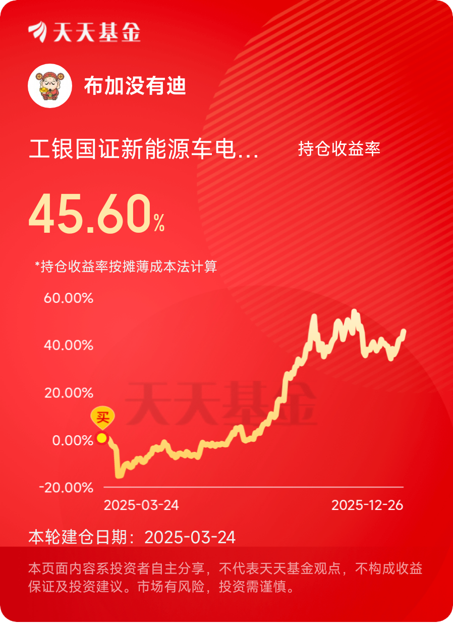 作为同时持有$工银黄金ETF联接E$和$工银国证新能源车电池ETF发起式联接C$的老持有人,过去一年多的投资经历让我收获了满意的收益,更对2026年稀贵金属及相关产业链的投资价值充满信心。从黄金突破4500美元/盎司的历史新高,到锂电材料价格持续攀升,市场信号已然清晰:稀贵金属正迎来多重因素共振的黄金投资周期。而这两只基金凭借各自独特的投资优势,成为我把握行业红利、实现资产增值的核心选择,未来我不仅会长期持有,更会择机持续加仓。