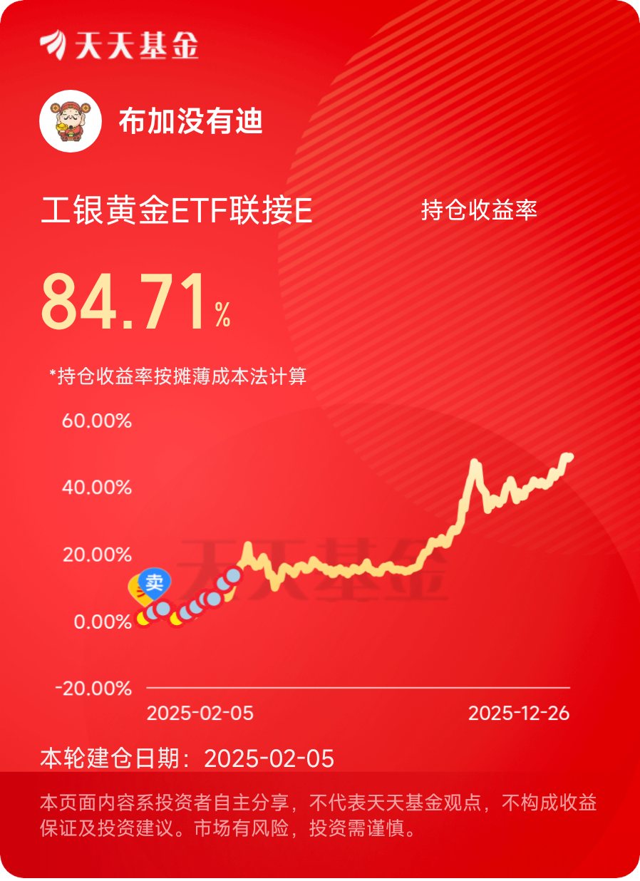 回顾持有历程,工银黄金ETF联接E的表现堪称“稳健且强劲”。我最初是在2024年底入手的,当时正是黄金价格突破3700美元/盎司的关键节点,基于对降息周期和避险需求的判断,我小仓位建仓了这只基金。没想到短短一年时间,不仅见证了黄金从3700美元涨到4500美元的历史时刻,基金净值也水涨船高,截至2025年12月26日,近12个月60.57%的涨幅让我的这笔投资收益翻倍 。更让我惊喜的是基金的低费率优势,之前持有过某同类黄金基金,一年下来仅管理费和托管费就比工银这只多花了几百元,长期累积下来差异十分明显。而且基金的流动性也完全满足我的需求,有一次急需用钱,持有满7天后赎回,当天就到账了,既没有手续费损失,又不耽误资金使用,这种便捷性是实物黄金无法比拟的。