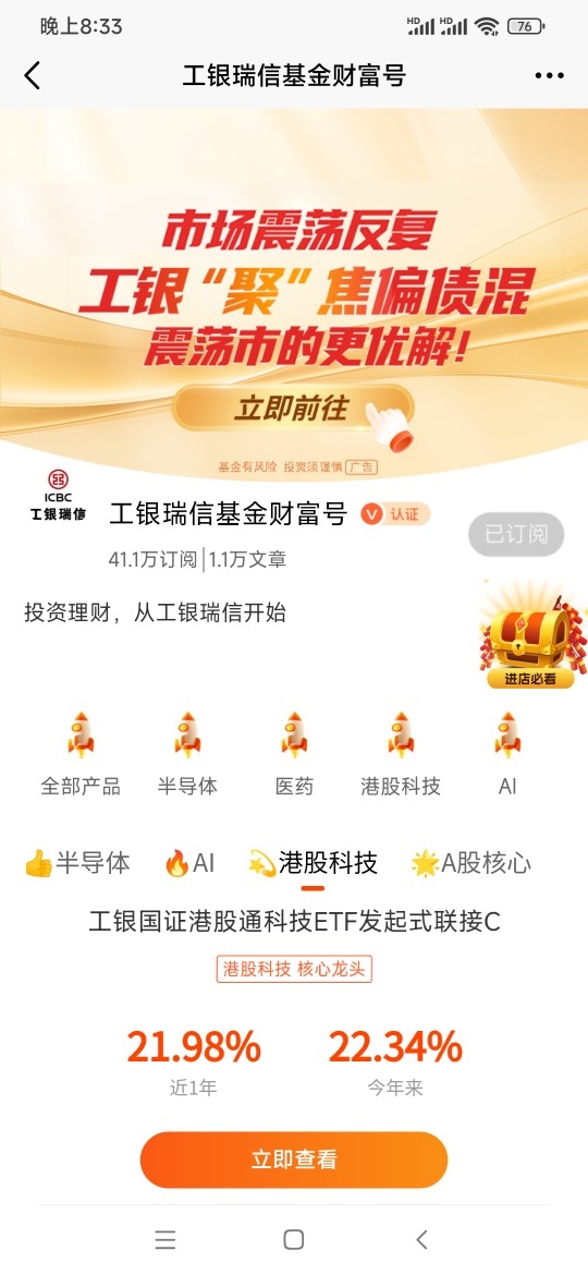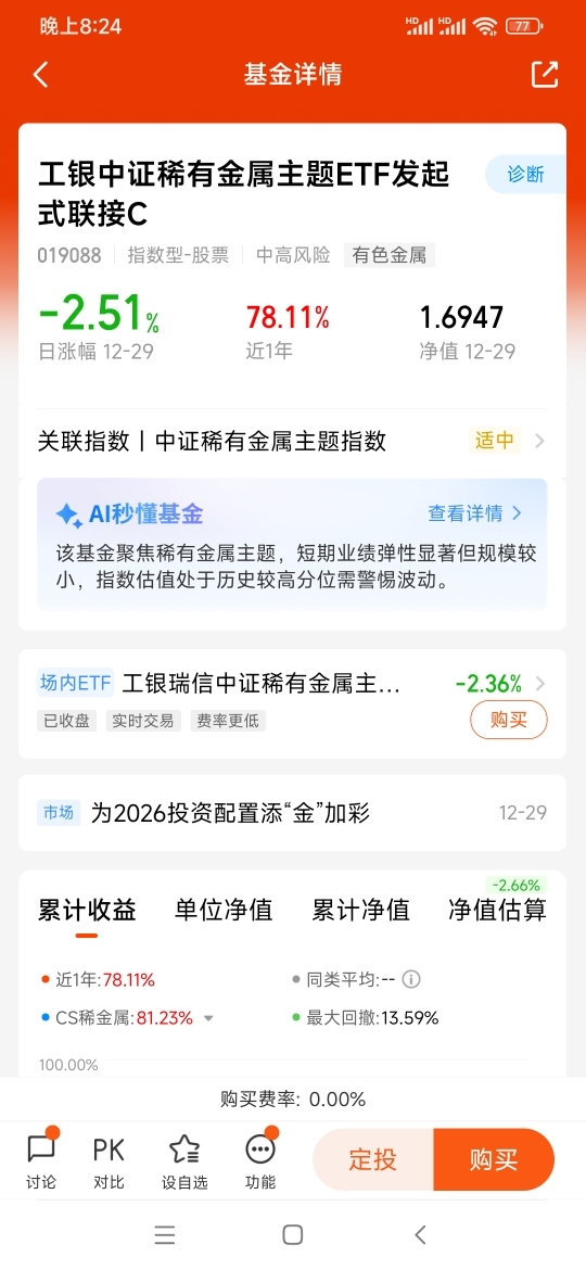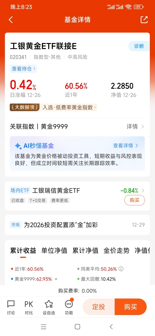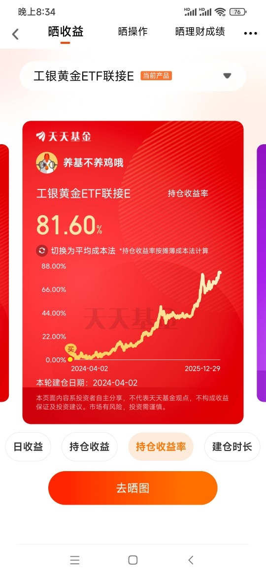 有人觉得黄金涨价虽好,但实物黄金折腾不灵活,回收还亏手续费,不适合上班族。我也这么认为,所以一开始就选基金参与。目前持有工银黄金ETF联接E已一年多,收益率81.60%远超预期,这也让我对2026年黄金行情更有信心。