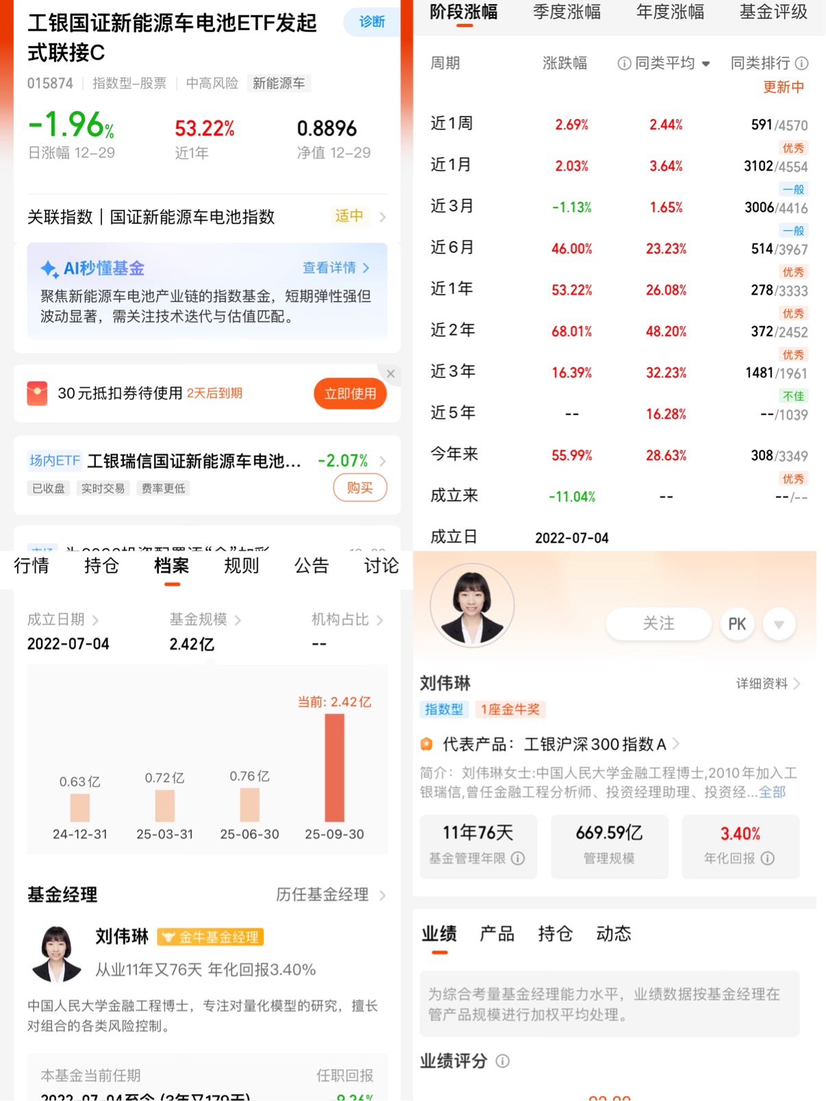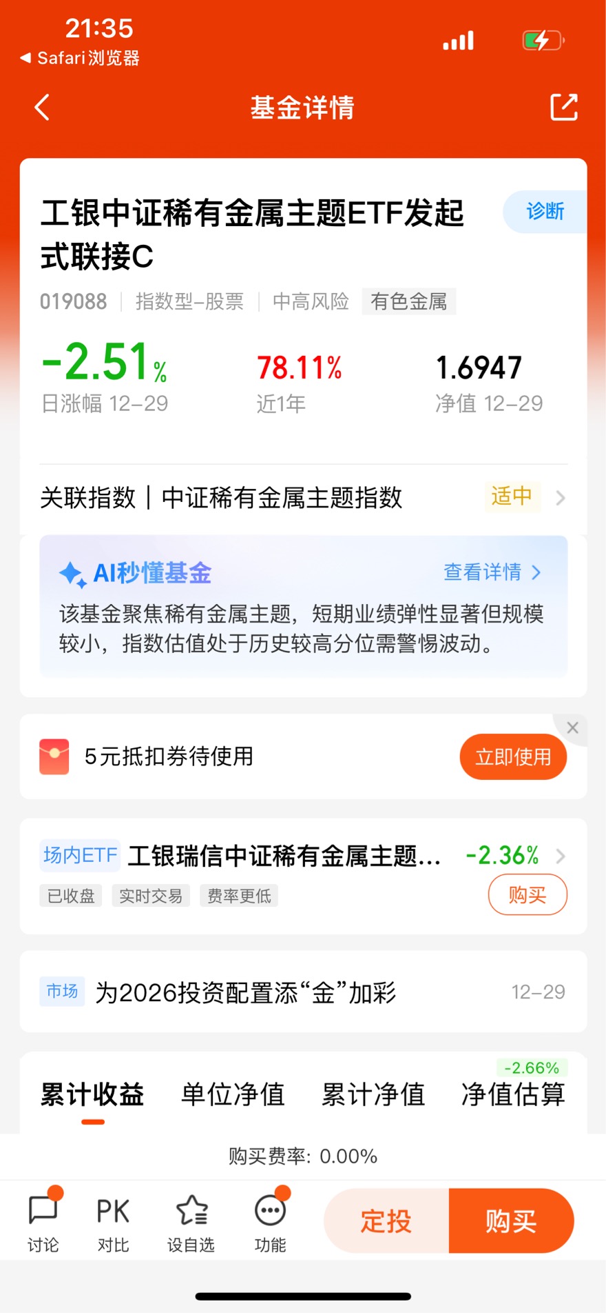 估值风险:现在稀贵金属的估值不算低(比如锂矿公司的PE在20-30倍),要是2026年业绩不及预期,估值会“杀”一波。所以得选“低估值+高成长”的基金,比如工银国证新能源车电池ETF发起式联接C,现在估值在行业中等,成长性却最强,安全边际更高。