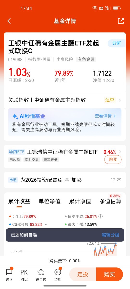再说说容易被忽视但潜力十足的稀有金属赛道,$工银中证稀有金属主题ETF发起式联接C$简直挖到了“工业宝藏”。可能有人觉得稀有金属离生活很远,其实不然:手机电池里有锂,新能源汽车的电机需要稀土,航空航天的精密部件离不开钨和钛。2026年是新能源、高端制造、半导体产业爆发的关键年,这些稀有金属作为“工业维生素”,需求只会越来越大。而且像锂、钴这些资源,供给端还受矿产分布、出口政策的影响,刚果金对钴出口加税就直接推高了钴价,未来缺口可能进一步扩大。这只基金聚焦的正是这些核心资源,前十大成分股涵盖了洛阳钼业、北方稀土、赣锋锂业这些行业龙头,能让我们精准搭上产业升级的快车,比起盲目买股票,通过基金布局更稳妥,也更适合普通投资者。