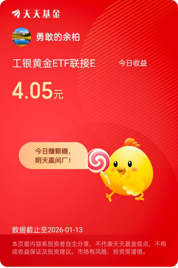 投资是一场漫长的旅程,需要耐心与智慧。工银黄金ETF联接E以其独特的投资价值与潜力,成为了我们长期投资组合中的重要一员。我将秉持长期投资的理念,与这只基金一同成长,共同迎接未来的挑战与机遇。@工银瑞信基金 #晒收益#