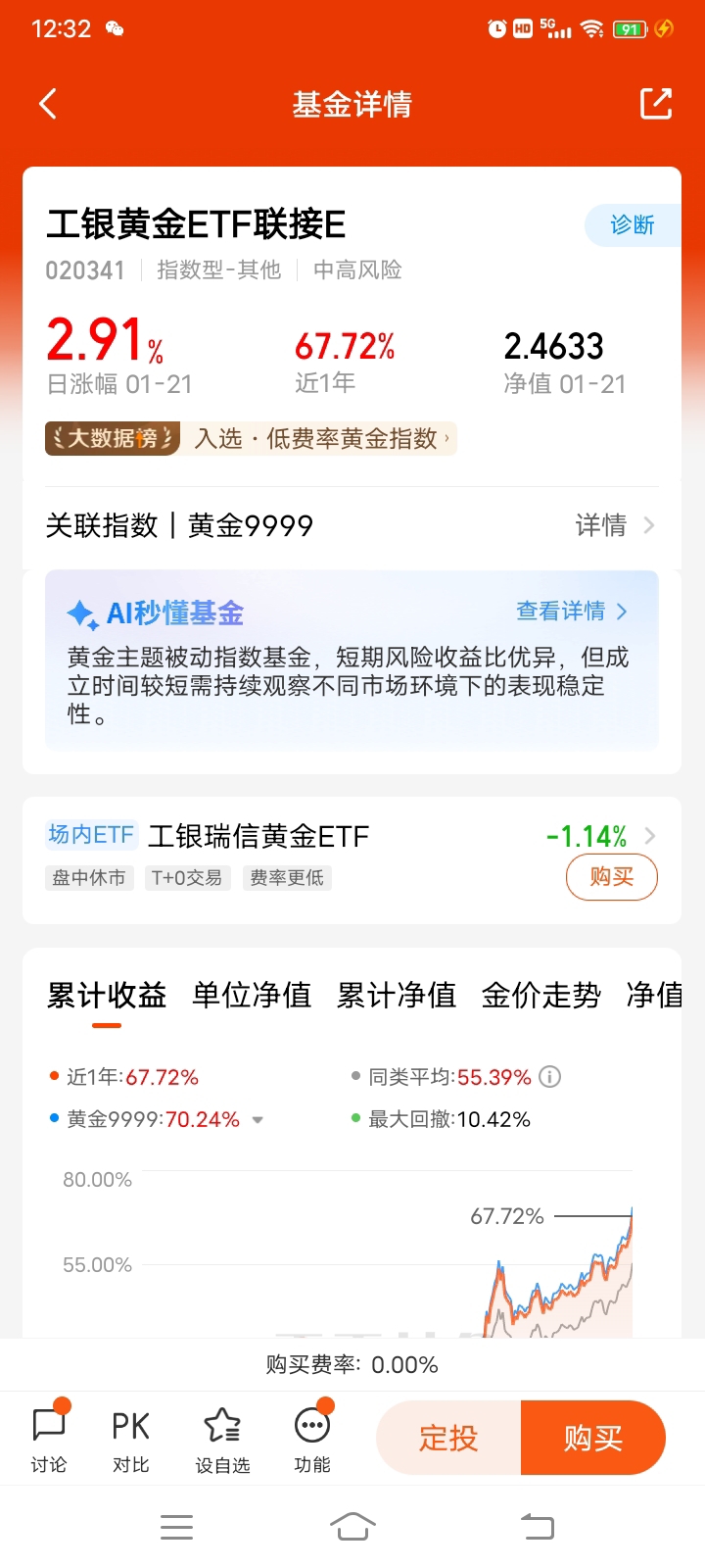 #2026你怎么看?# 我看黄金这波行情很有看头,1月21日现货和COMEX黄金双双站上4800美元/盎司,刷新历史新高,主要是特朗普扬言对欧洲加征关税,格陵兰岛争端升级推高了避险情绪。机构都挺看好黄金走势,地缘紧张+央行购金+美联储降息预期,中长期上行趋势明确。我打算小幅度加仓$工银黄金ETF联接E$ ,现有仓位加20%,毕竟黄金牛市都会有中期回调,现在正是布局机会,闲置资金配置一部分,既跟上行情,也不会因后续波动影响整体组合,心里更有底。@工银瑞信基金
