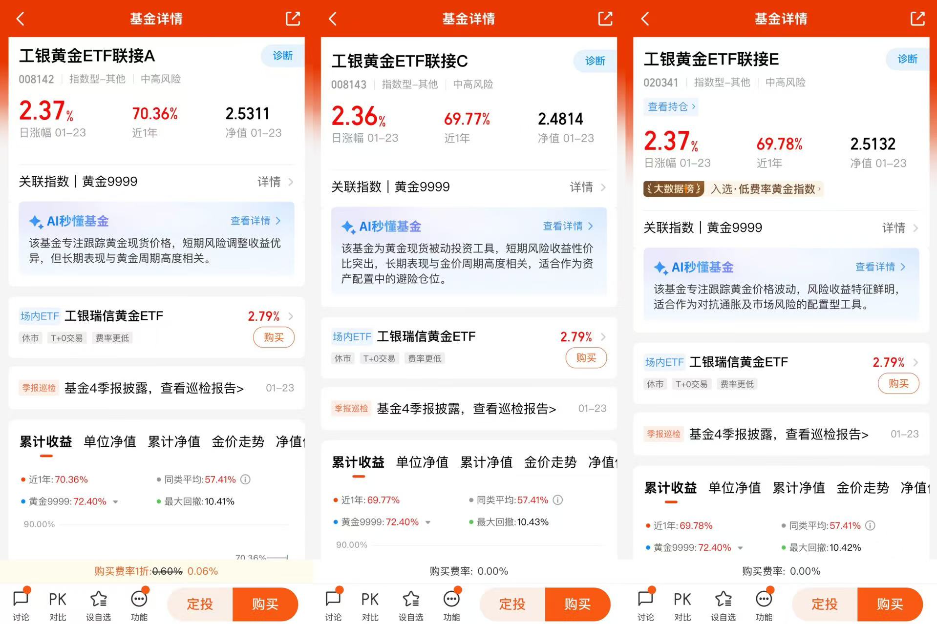 特别是工银黄金ETF联接(A:008142;C:008143;E:020341)的E份额更是投资者非常高效的投资工具,工银瑞信黄金ETF联接E(021499)相较其它同类指跟踪黄金现货合约(AU9999)的ETF联接产品的优势在于: