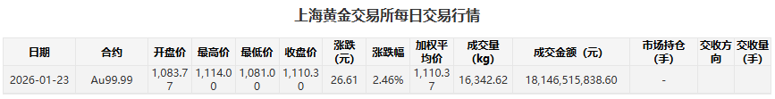 2025年10月底,现货黄金一度突破了4330.5美元/盎司,目前更是超过4900美元/盎司,5000美元一触即发。我非常看好黄金的长期投资机会,上海黄金交易所Au99.99近一年已上涨超过80%。在流动性宽松以及避险情绪等因素推动下,黄金价格上涨动能依然充沛。上海黄金交易所2026年1月23日AU99.99的收盘价达到1110.30元/g,维持在今年高位,黄金作为多元配置资产的热度或还将持续。
